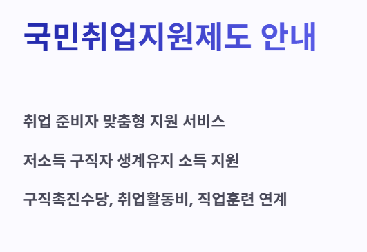 국민취업지원제도는 취업을 준비하는 사람들에게 맞춤형 취업지원 서비스를 제공하고, 저소득 구직자에게는 생계유지를 위한 최소한의 소득을 지원하는 제도입니다.
