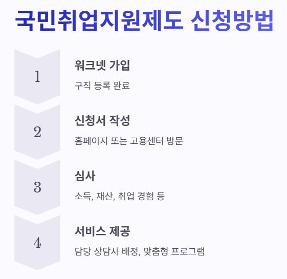 - 필요 서류: 신분증, 소득 및 재산 증빙서류, 취업 경험 관련 자료 등