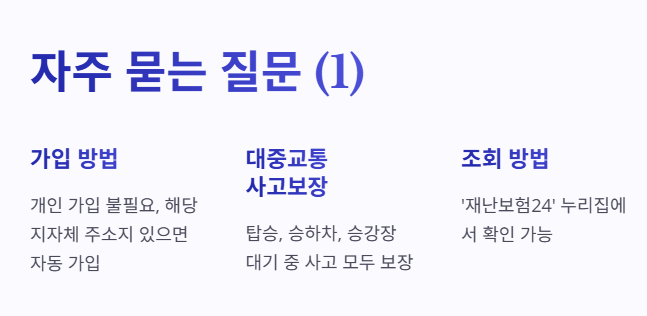 - 광범위한 보장: 자연재해, 대중교통 사고, 화재, 붕괴, 폭발 등 일상생활에서 발생할 수 있는 다양한 사고를 보상합니다.