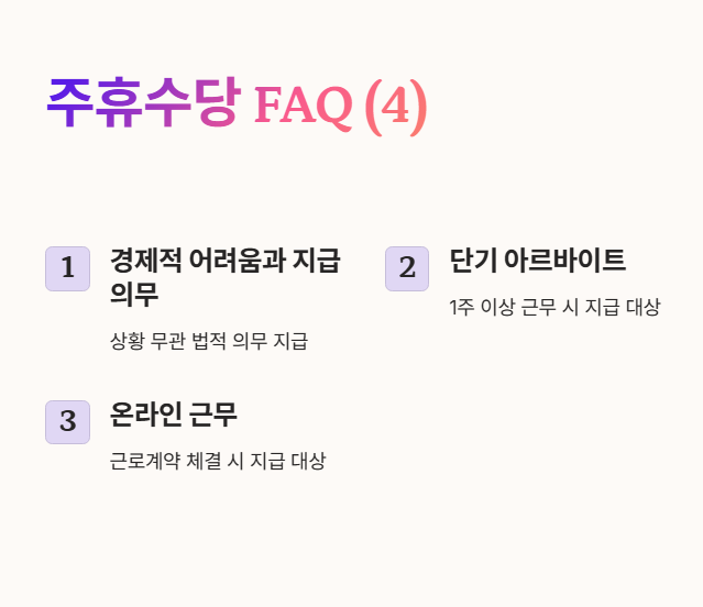 주휴수당에 대한 개념과 지급 조건을 알고 나면, 여전히 궁금한 점이 많을 수 있습니다. 아래는 자주 묻는 질문과 그에 대한 답변을 정리한 내용입니다.