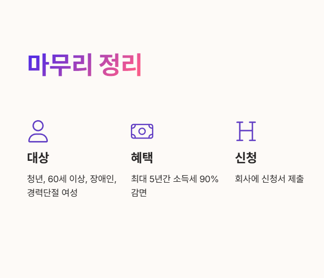 ✔️ 혜택: 최대 5년간 소득세 90% 감면 (경력단절 여성·고령자는 3년, 70%)