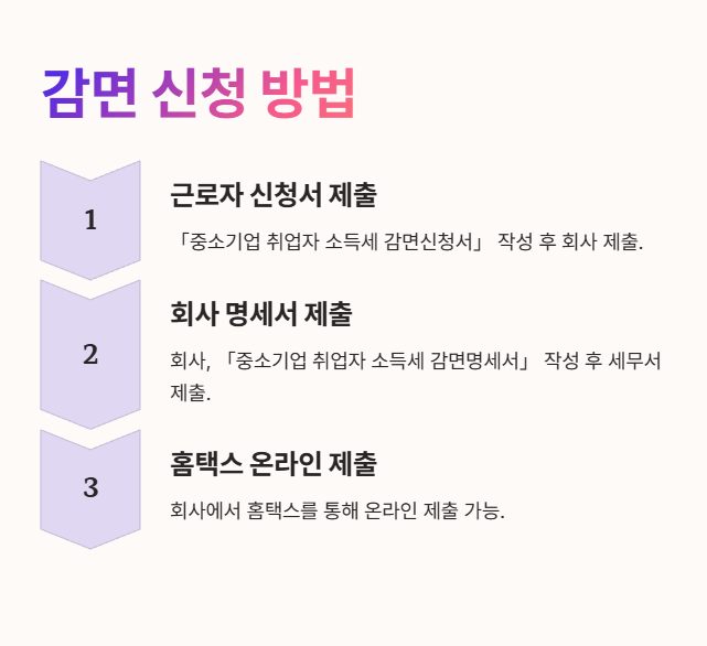 ✔️ 신청: 근로자는 회사에 신청서 제출 → 회사가 세무서에 감면 명세서 제출