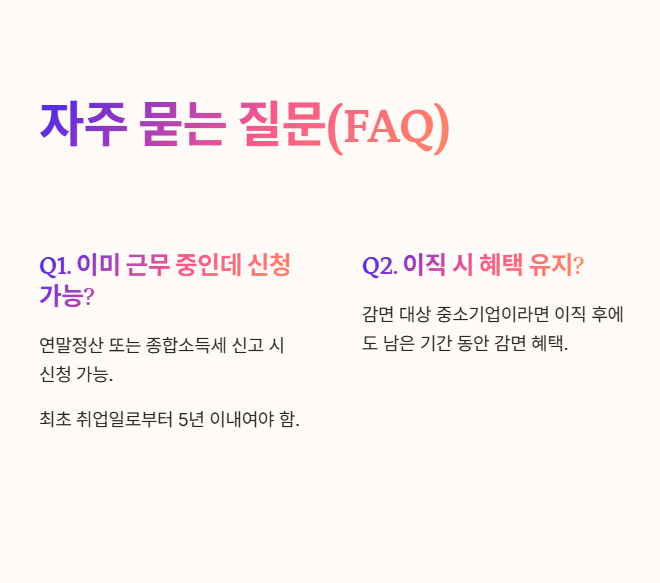 ✔️ 예) 2022년 중소기업 취업 후 2024년에 이직 → 2027년까지 감면 가능