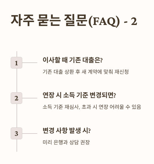 기간 연장 시에도 소득 기준을 재심사하며, 소득 기준이 초과되면 연장이 어려울 수 있습니다. 변경 사항이 있다면 미리 은행과 상담하는 것이 좋습니다.
