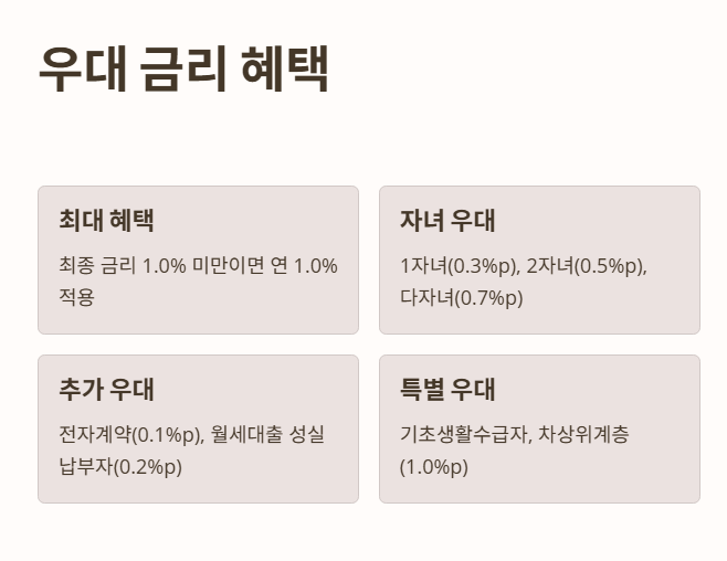 - 1.0%p 우대: 기초생활수급자, 차상위 계층, 한부모 가족
