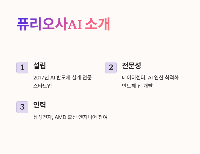 퓨리오사AI는 2017년에 설립된 AI 반도체 설계 전문 스타트업으로, 데이터센터와 AI 연산에 최적화된 반도체 칩을 개발하고 있습니다.