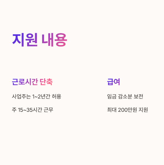 💡 예를 들어, 기존 주 40시간 근무자가 30시간으로 단축할 경우, 5시간까지는 통상임금 100%, 추가 5시간은 80% 지원됩니다.